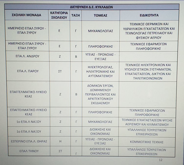 Αναλυτικότερα, η λίστα με τα ολιγομελή Τμήμα των ΕΠΑ.Λ. του νομού Κυκλάδων που θα λειτουργήσουν είναι: