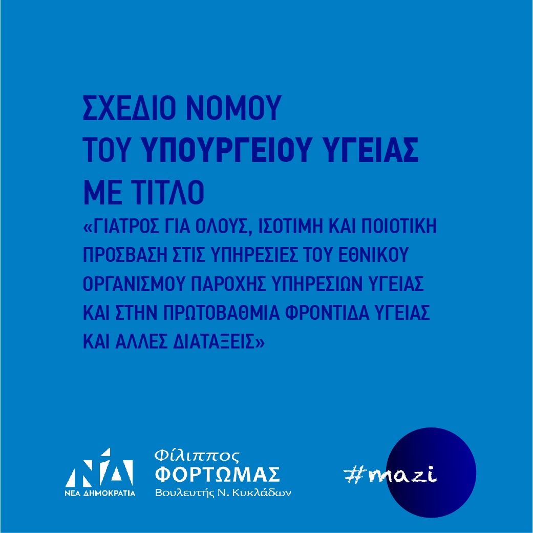 Ως μία από τις μεγαλύτερες μεταρρυθμίσεις στον τομέα της Υγείας χαρακτήρισε ο βουλευτής Κυκλάδων της Νέας Δημοκρατίας, κ. Φίλιππος Φόρτωμας το σχέδιο νόμου του Υπουργείου Υγείας με τίτλο «Γιατρός για όλους, ισότιμη και ποιοτική πρόσβαση στις υπηρεσίες του Εθνικού Οργανισμού Παροχής Υπηρεσιών Υγείας και στην Πρωτοβάθμια Φροντίδα Υγείας και άλλες διατάξεις», που ψηφίστηκε κατά πλειοψηφία χτες στην Ολομέλεια της Βουλής.