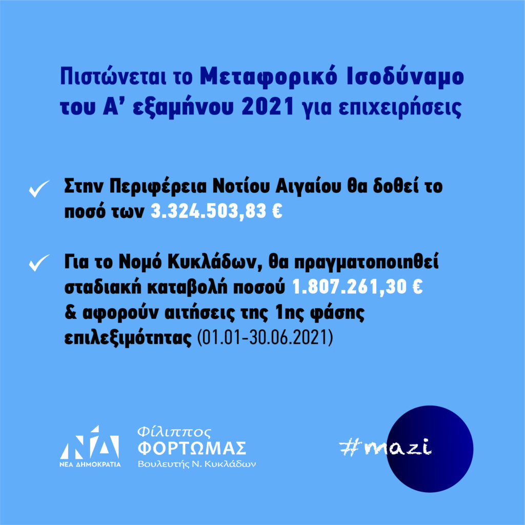 Την ικανοποίησή του εξέφρασε ο βουλευτής Κυκλάδων της Νέας Δημοκρατίας κ. Φίλιππος Φόρτωμας, για την έναρξη πληρωμών του Μεταφορικού Ισοδύναμου για το Α’ Εξάμηνο του 2021 για επιχειρήσεις. Η ηγεσία του Υπουργείου Ναυτιλίας με την πολύτιμη αρωγή της Γενικής Γραμματείας Αιγαίου και Νησιωτικής Πολιτικής, συνεχίζουν την εφαρμογή αυτού του δίκαιου και αναγκαίου μέτρου για όλους τους νησιώτες.