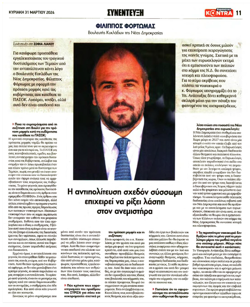 Συνέντευξη του Βουλευτή Κυκλάδων της Νέας Δημοκρατίας Φίλιππου Φόρτωμα στην εφημερίδα Κυριακάτικη Kontra News και τη δημοσιογράφο Σοφία Λιάκου.
