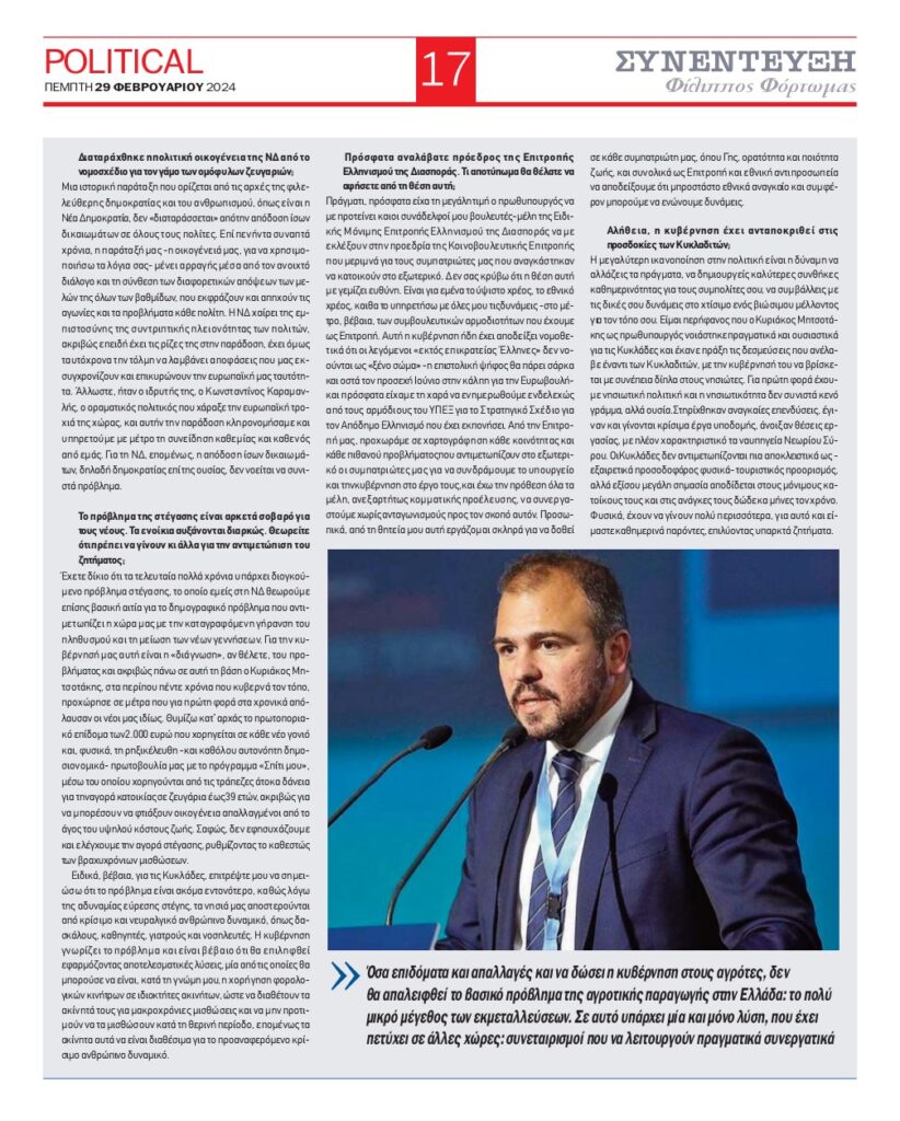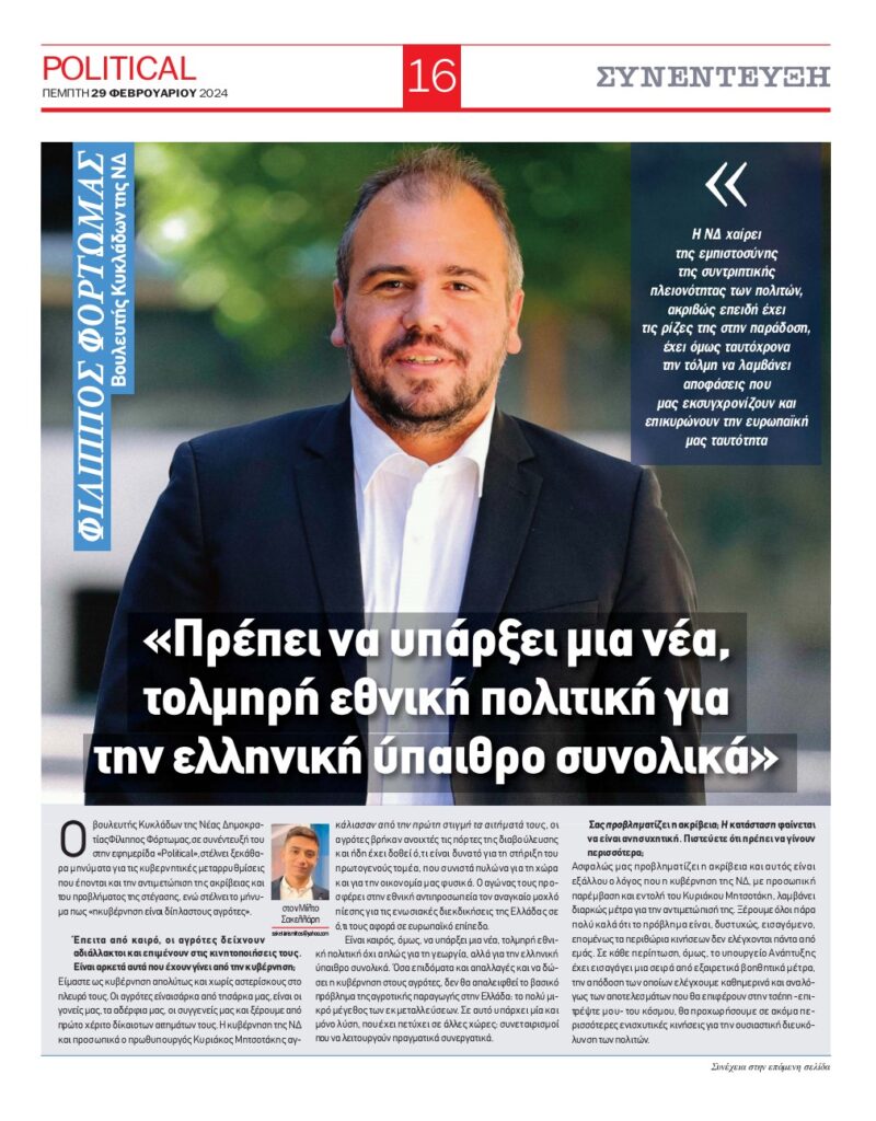 Συνέντευξη εφ’ όλης της ύλης του Βουλευτή Κυκλάδων της Νέας Δημοκρατίας Φίλιππου Φόρτωμα στην ημερήσια ψηφιακή εφημερίδα “Political” και στον δημοσιογράφο Μίλτο Σακελλάρη.