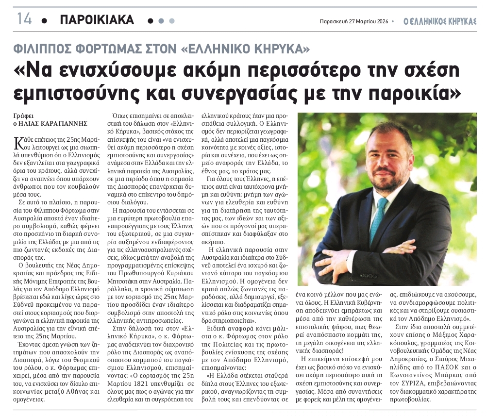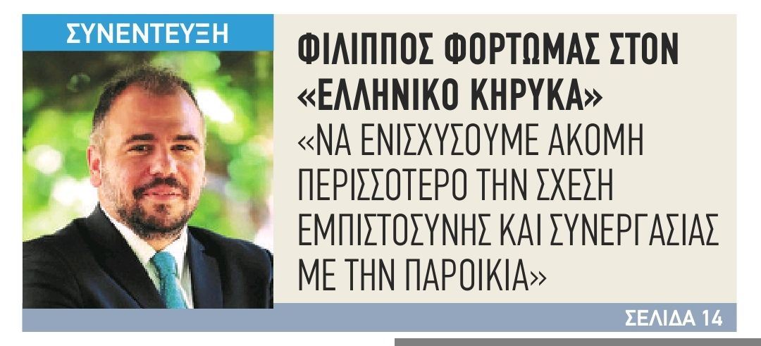 Φίλιππος Φόρτωμας στον “Ελληνικό Κήρυκα”: «Να ενισχύσουμε ακόμη περισσότερο την σχέση εμπιστοσύνης και συνεργασίας με την παροικία»