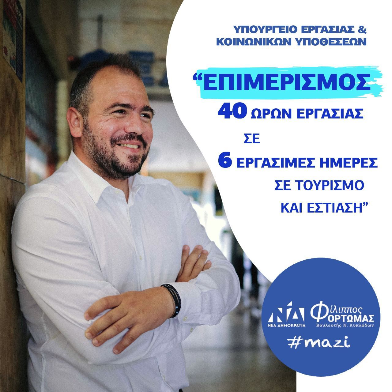«Μετά από παρέμβασή μου στο Υπουργείο Εργασίας, εκδόθηκε διευκρινιστική Εγκύκλιος, σύμφωνα με την οποία, οι εργαζόμενοι στον κλάδο του Τουρισμού και της Εστίασης, έχουν την επιλογή, μετά από τη σύμφωνη γνώμη του εργοδότη τους, να επιμερίσουν τις 40 ώρες εβδομαδιαίας εργασίας σε έξι εργάσιμες ημέρες. Δίνουμε λύσεις στα καθημερινά προβλήματα των συμπολιτών μας! Συνεχίζουμε μαζί!» δήλωσε ο κ. Φόρτωμας μετά την έκδοση της Εγκυκλίου