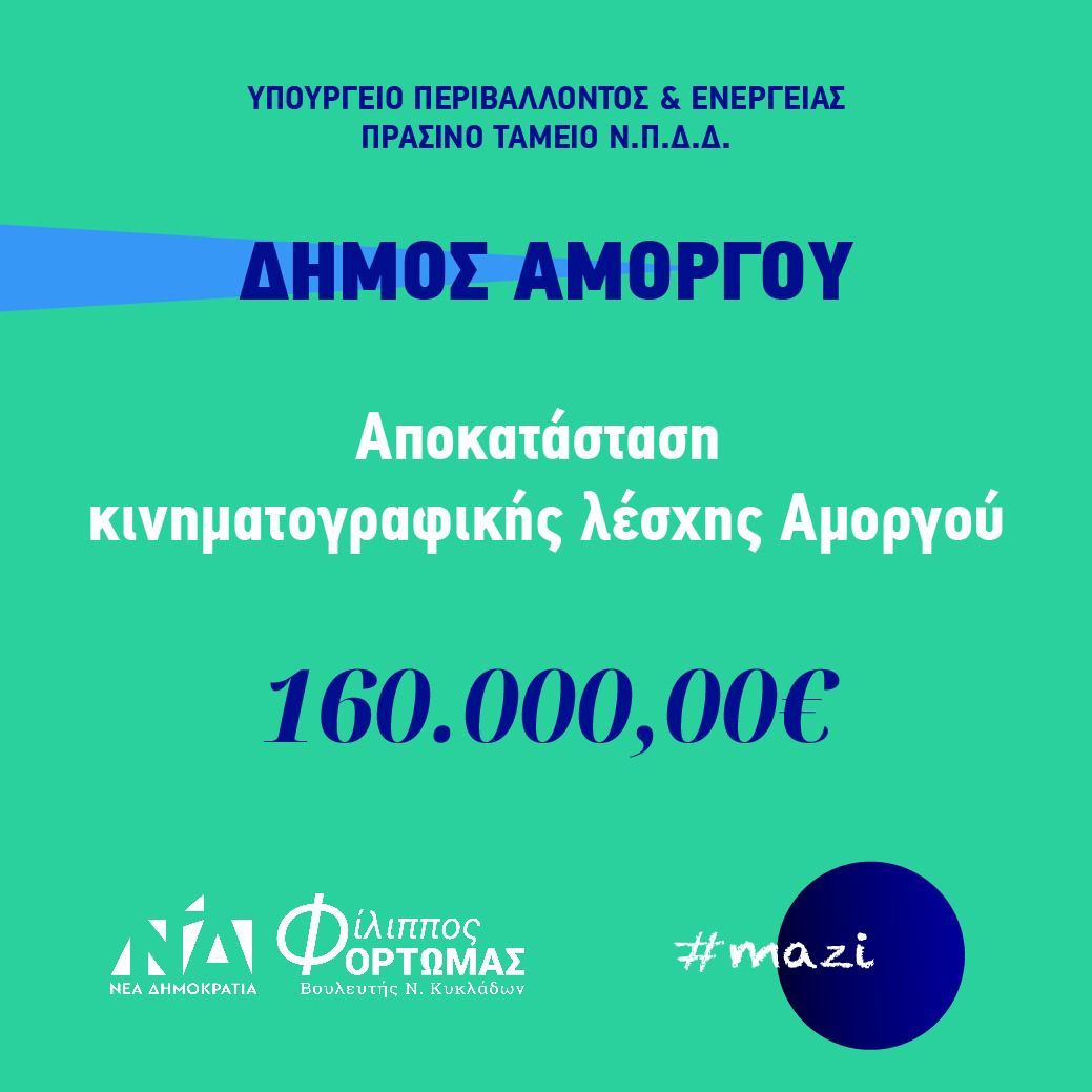 Συγκεκριμένα, για το Δήμο Αμοργού, εγκρίθηκε το ποσό των 160.000,00 €, για την προμήθεια αποκατάσταση κινηματογραφικής λέσχης και για το Δήμο Φολεγάνδρου, εγκρίθηκε επιχορήγηση ύψους 128.000,00 €, για ανάπλαση τμήματος παραλιακού μετώπου στην περιοχή «Καραβοστάση».