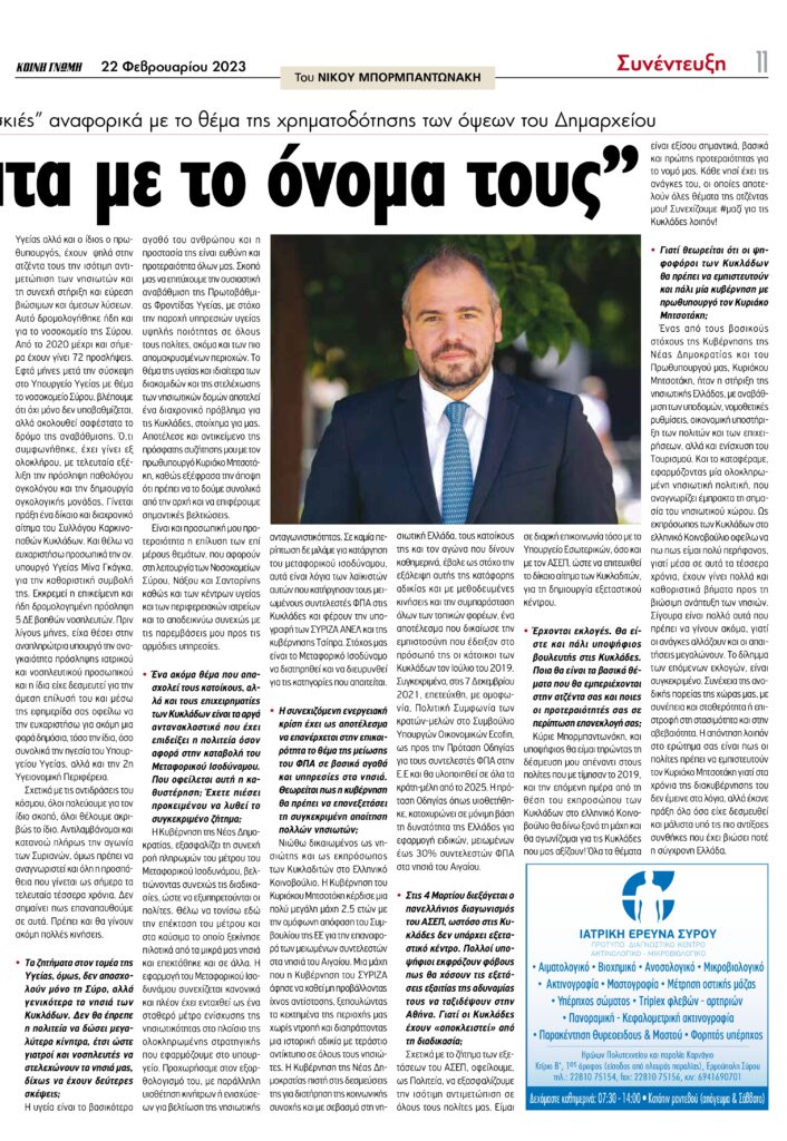 Για σημαντικά θέματα των Κυκλάδων, όπως η υπόθεση επισκευής του δημαρχιακού μεγάρου Ερμούπολης, η στελέχωση του Γενικού Νοσοκομείου Σύρου, τα ζητήματα υγείας των νησιών, το Μεταφορικό Ισοδύναμο, οι συντελεστές ΦΠΑ και οι επερχόμενες εθνικές εκλογές, μίλησε σε συνέντευξή του στην εφημερίδα “Κοινή Γνώμη”, ο βουλευτής Κυκλάδων της Νέας Δημοκρατίας, κ. Φίλιππος Φόρτωμας.