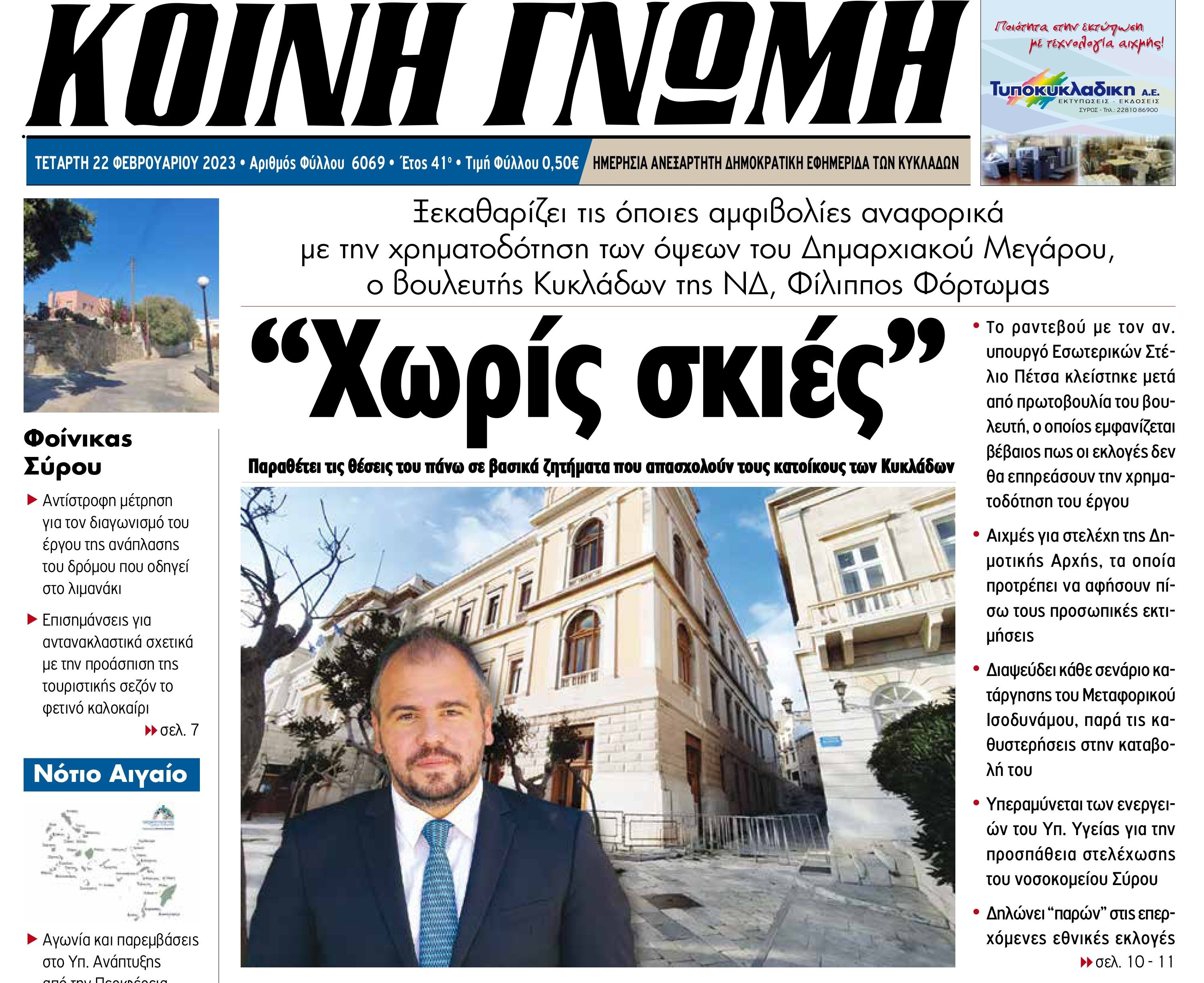 Για σημαντικά θέματα των Κυκλάδων, όπως η υπόθεση επισκευής του δημαρχιακού μεγάρου Ερμούπολης, η στελέχωση του Γενικού Νοσοκομείου Σύρου, τα ζητήματα υγείας των νησιών, το Μεταφορικό Ισοδύναμο, οι συντελεστές ΦΠΑ και οι επερχόμενες εθνικές εκλογές, μίλησε σε συνέντευξή του στην εφημερίδα “Κοινή Γνώμη”, ο βουλευτής Κυκλάδων της Νέας Δημοκρατίας, κ. Φίλιππος Φόρτωμας.